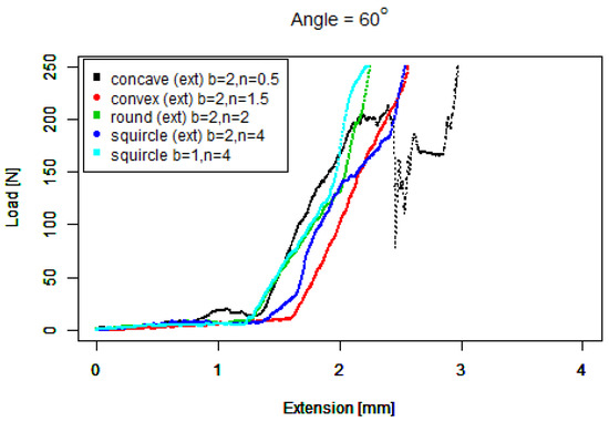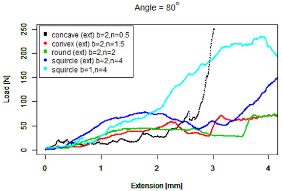 For our extruded concave () tip, Figure 8 shows a much better performance of this tip against the 80 concrete, as compared to the two previous tips, with a maximum extension of around 5 mm. However, the tip performed slightly worse than the basic concave tip against both the 40 and 60 angled pavers.