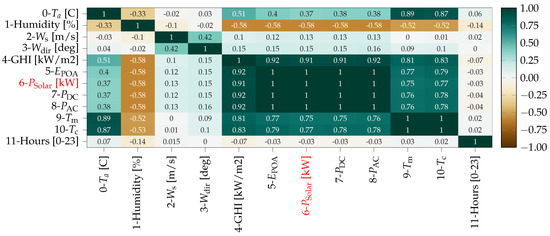 presents near 0 correlation, thus being discarded from the suitable features according to Pearson’s criteria. Lastly, humidity exhibits a relatively high anti-correlation. Then, according to the Pearson approach the selected features would be: humidity, GHI,