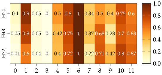 Figure 10b focuses similarly on previous samples. Note that, the combinations on the y-axis are those of the best performer for each configuration, that we present the three horizons and 5 ML-methods at once. In that sense, the x-axis must be taken as a category and not a scale. H24 and H72 have a negative and positive offset, respectively, as to facilitate visualization of the three horizons at once. Regarding the consistency of this method, there are a number of interesting conclusions to be dragged from these images. Some are quite intuitive, such as that the