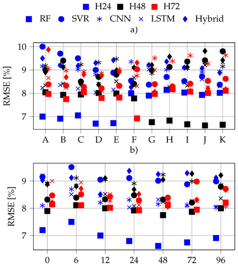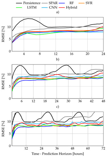 Figure 11a, b and c present the RMSE of the best performers of each ML-method for the three different prediction horizons, 24, 48 and 72 h, respectively. Then,