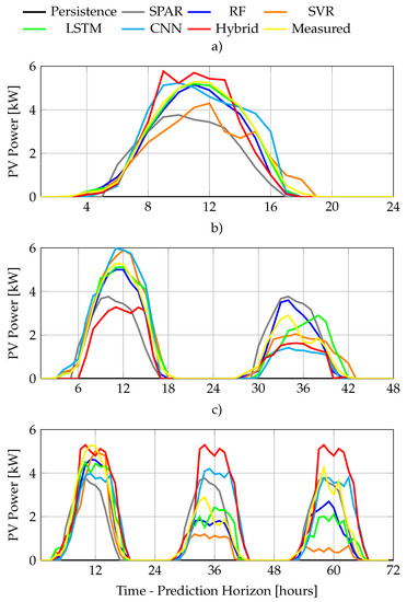 17]. In this direction, we propose the inclusion of a PV-performance model as part of the data-mining stage. In this way, we effectively include knowledge of the physical relationships between meteorology and an array’s operational state. This model only requires wind speed and air temperature measurements, along with some basic data from the PV’s datasheet, thus making it extremely easy to implement in practice. Then, given the difficulties in generalising performance in ML applications, we propose a methodology aiming to find performance patterns across the different ML-models via systematic comparison of five different methods: RF, SVM, CNN, LSTM and CNN–LSTM; but also SPAR and a naive Persistence. We evaluate the proposed physics-informed approach in a study-case with a PV array installed in Denmark for three different horizons: 24, 48 and 72 h-ahead. These horizons were selected based on their relevance in classic market participation, energy management applications and on the general gap pointing towards the lack of multi-output predictors beyond six steps head [