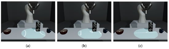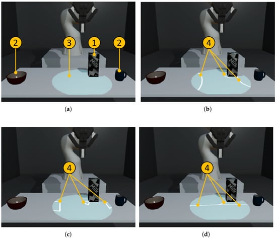 In recent decades, AR technology has been frequently used for human–robot collaboration [33]. Previous work has mainly focused on the use of HMDs, MAR, SAR and the visualization of the robot motion intent [9,34,35]. Rosen et al. showed that AR is an improvement compared to classical desktop interfaces when visualizing the intended motion of robots [34]. However, while visualizations of motion intent have been studied extensively in previous work [9,10,11,12,13,14], communicating cobot perception remains an open challenge. It is vital that the human user can recognize what the semi-autonomous robotic system perceives explicitly (e.g., objects such as a glass or a bottle) because this enables users to recognize any occurred error in the robot’s perception [16,17]. The non-perception of objects can have especially drastic consequences, as often demonstrated in autonomous driving. (Guardian. https://www.theguardian.com/technology/2018/mar/19/uber-self-driving-car-kills-woman-arizona-tempe, last retrieved 30 December 2021) In this paper, we focused on the communication of cobot perception, and in particular, different methods to make the cobot’s sensor-based detection of objects in its surroundings visible and clear to the user.