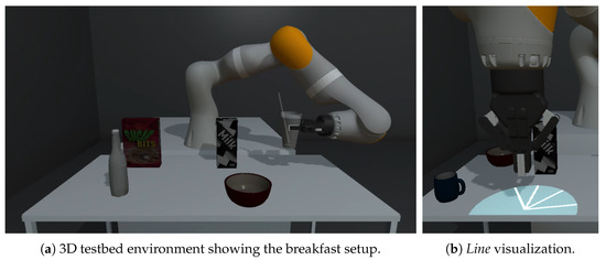 We wanted to determine which visualization technique allows users to recognize the cobot’s perception errors quickly, accurately and with minimal effort. Therefore, users were presented with a simple task (see Section 4.4 and Section 5.4). They had to observe a virtual scene where a robot arm was moving across a breakfast table containing multiple items. Initially the current visualization technique shows each object as detected and perceived by the cobot. After a randomized time in an interval of 5–15 seconds in experiment I (see Section 4) and an interval of 3–15 seconds in experiment II (see Section 5), the cobot ceased to detect a random object; indicated by a vanished visualization. The user had to a) recognize this situation as quickly as possible and b) identify the no longer perceived object.