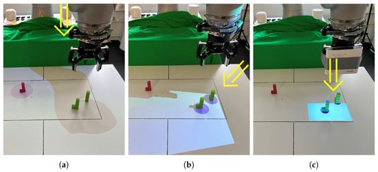- Cobot flanch-mounted projection: By mounting the pico-projector to the cobot’s flanch next to the gripper, the cobot or its gripper do not cast a shadow within the projection area. Because the light comes from above, the size of the objects’ shadows is reduced in contrast to the other projector settings, as shown in Figure 3c. As a drawback, the projection area is limited, and therefore, increases the need for visualization which can also highlight off-screen objects, which are currently not placed within the projection area.