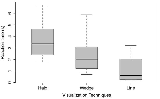 Comparison of the reaction times for the three different visualization techniques: Wedge; Halo; and Line.