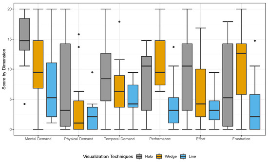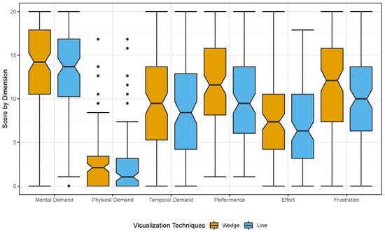 The mean of the task load ratings as measured by the NASA Raw-Task Load Index (Raw-TLX) [39] are (in ascending order): Line = 42.39 (SD = 15.02) and Wedge = 47.19 (SD = 16.03). A Wilcoxon signed-rank test showed a significant difference between Wedge and Line (W = 4483.5, Z = 3.19, p = 0.001 ***, r = 0.21). Concerning the task load, we can conclude that Line has a significantly lower task load than Wedge. The resulting task load scores per dimension are presented in Figure 8.