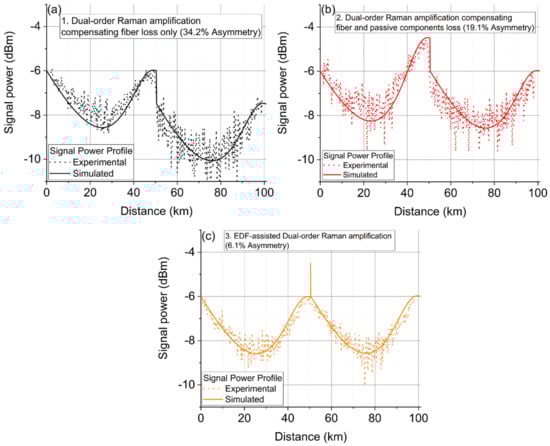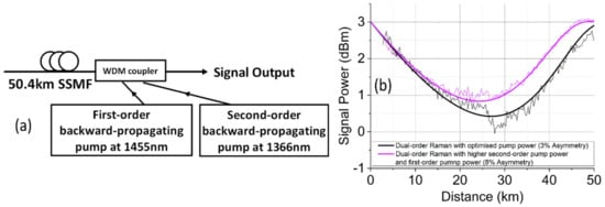 Figure 2a shows a dual-order backward-pumping DRA scheme including both a 1365 nm Raman fiber laser and a 1455 nm pump seed [49,50]. Figure 2b shows the simulated and experimentally measured signal power profiles along the fiber. The use of the dual-order BW-pumping scheme can improve the symmetry of signal power profile, but it requires the optimization of the first- and second-order pump power [23]. As shown in Figure 2b, to achieve 97% symmetry, the first- and second-order pump power was set to ~100 and ~330 mW respectively. When the second-order pump power is increased beyond this optimum, the signal power symmetry degrades to 92% with ~33 and ~600 mW first- and second-order pump powers, respectively. This asymmetry accumulation was mainly because the signal power was increased near the signal output, as the signal gain was pushed into the middle of the fiber span using higher second-order pump power [23], whilst for lower second-order pump powers, the asymmetry approaches that of the first-order pumped configuration.