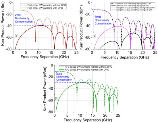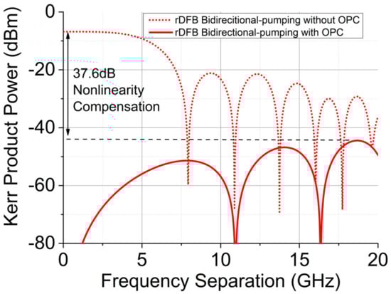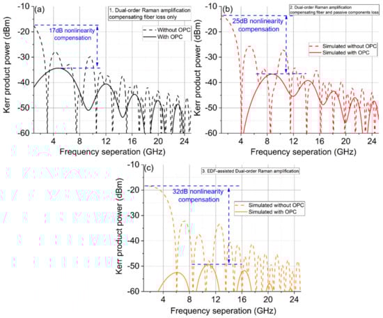 Figure 11 shows the Kerr product reduction versus frequency separation using almost symmetrical signal power profile (bidirectional pumping with random distributed feedback fiber laser). In Figure 11, without OPC, the nonlinear product power was up to −6.8 dBm near the low frequency range, but with OPC, the nonlinear product power was decreased to −44.4 dBm at 18 GHz. There was 37.6 dB nonlinear product degradation with the 97% symmetrical signal power profiles over 62 km SSMF, which was comparable with the optimized dual-order backward pumping Raman amplification over 50 km SSMF.