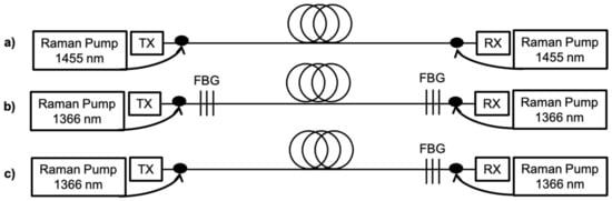 The third and final approach uses a random distributed feedback Raman laser amplifier (Figure 7c). This is another fiber laser amplifier similar in part to the scheme shown in Figure 3. This is significantly different from a closed cavity with two FBGs. The scheme is essentially bidirectional Raman pumping using a half-open-cavity design with a single high-reflectivity FBG at 1455 nm located at the end of the span that reflects the 1455 nm Stokes in the backward direction. The second-order pump in front of the span, does not create a seed traveling in forward direction (either by inserting an FBG or an active seed) but rather amplifies the seed created at the end of the span. The lack of an FBG on the side of the forward pump reduces the RIN transfer to the 1455 nm Stokes in exchange for a reduction in conversion efficiency in comparison to the other two proposed setups [35]. This reduced interaction between the signal and the forward pumping is particularly important, as the RIN transfer from high-power forward pumps can be a limiting factor in data transmission [42,43].