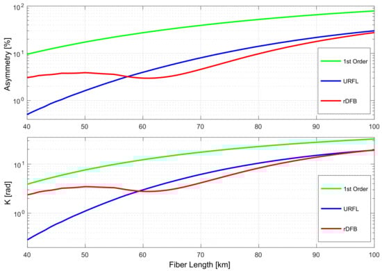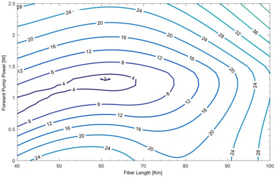 In order to perform a comparison of signal power asymmetry between the three proposed configurations, we simulated power profiles of a single channel at 1545 nm with a fixed launch power of 0 dBm. For each value of the forward pump power (FPP) and span lengths ranging from 40 to 100 km, the backward pump was adjusted to provide 0 dB net gain. Signal power asymmetry was calculated as in [12,13]. Full results using random DFB laser amplification (Figure 7c) are shown in Figure 8. Data provide a broader picture of the asymmetry evolution in transmission over a broad range of forward pump powers up to 2.5 W and lengths with the optimal backward pumping (0 dB net gain). The lowest asymmetry point is found to be at 62 km, with signal power asymmetry just below 3% (97% symmetry). Further optimization is possible based on simultaneous ASE noise minimization and nonlinearity compensation [29].