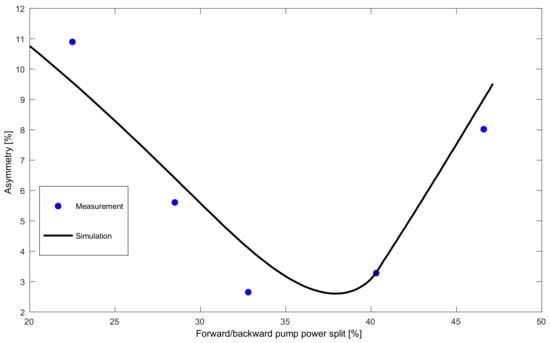 In order to confirm the simulation results, in Figure 9 we compare the simulated prediction and experimentally measured asymmetry vs. forward pump power split for a signal at 1545 nm in a 60 km span (the particular length was chosen due to availability of a SSMF fiber reels). The discrepancies between measurement and simulation are attributable mainly to the noisy experimental power profiles, as well as the mismatch of Raman gain and attenuation coefficients, since for consistency with previous simulations we used standard values for SSMF instead of measured coefficients.