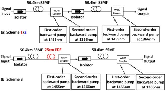 Scheme 1 was the dual-order DRA with backward pumping which was the same as Figure 2 in each individual span that included both the first-order pump seed at 1455 nm and the second-order pump at 1366 nm [49,50]. The gain of the dual-order DRA compensated only the loss from the SSMF, and the losses of the passive components (e.g., signal pump combiners, isolators) was not compensated. In scheme 2, the experimental setup was the same as scheme 1, and the pump power for the second span also remained the same, but the 1.5 dB loss due to fiber attenuation and passive components between the two spans was compensated by more Raman power from the first span. This means that the signal output power from the first SSMF was overpowered by ~1.5 dB. In scheme 3, to compensate the loss from passive components without sacrificing the symmetry of the two-span link, a 25 cm EDF (Fibrecore M-12(980/125)) was used between the SSMF and the WDM coupler at the end of the first span as illustrated in Figure 12b, which enabled 1.5 dB amplification within this 25 cm erbium-doped fiber.