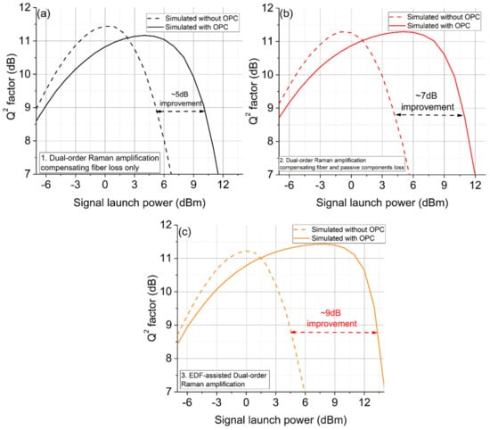Figure 16 shows simulated transmission performances at 2000 km using the EDF-assisted Raman Scheme. As expected, the most symmetrical Raman scheme (Figure 13c and Figure 15c) gives ~8dB Q2 factor improvement (Q2 factor is defined as 20log10(sqrt(2).*erfcinv(2.*(BER)). In addition, the EDFA noise at the transmitter and receivers was deliberately removed for the EDF-assisted Raman scheme to evaluate the impact of such noise. In this case over 2000 km, the impact of the noise from EDFAs at the transmitter and receiver becomes negligible as the Q2 factor differences are very small. Thus, the accumulated noise from the Raman amplified link is more dominant compared with transceiver noise (fundamentally limited by higher-order parametric noise), and therefore the benefit of the Q2 factor improvement can be revealed for long-haul transmission systems with an optimized mid-link OPC [21,55]. Therefore, using the symmetrical EDF-assisted Raman link in long-haul transmission systems can improve the fiber nonlinearity compensation efficiency and the transmission performance in a mid-link OPC system.