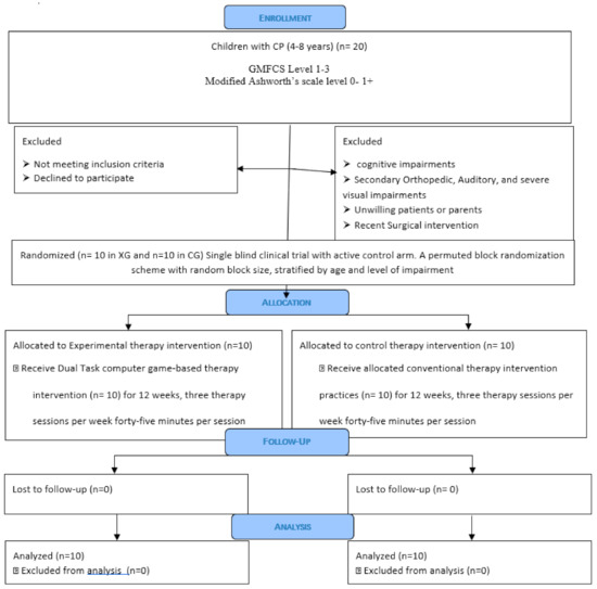 Children diagnosed with CP were recruited for this single-blind randomized clinical trial with an active control arm (see Figure 1 for CONSORT diagram). The study was conducted according to international standards of Good Clinical Practice. Ethics approval was obtained from the Health Research Ethics Board (HREB), University of Manitoba, Winnipeg, Canada, and the Institutional Ethical Committee of Shree Dharmasthala Manjunatheshwara (SDM). University, Karnataka, India. This study is registered at ClinicalTrial.gov with the identifier # NCT03873441. The study participants were recruited from the Pediatric Physiotherapy Outpatient Department (OPD) of SDM College of Medical Sciences and Hospital. Successfully screened participants were randomized to the experimental group (XG) or control group (CG) by having them choose one of 20 sealed opaque envelopes that contained a letter signifying the group assignment. A graduate student not involved in the study produced the envelopes: 10 that contained a letter for the experimental group and 10 for the control group. The envelopes were thoroughly shuffled before each selection.