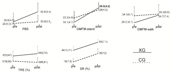 As presented in Table 6 and Figure 3, there was a significant improvement in SR pre- to post-intervention in both the XG and CG and no significant time*group effect. The effect size was moderate, with a value of 0.3. In the case of TRE, no significant effects were observed for time or time*group.