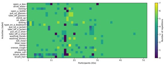 To validate the proposed approach, the publicly available PAAL ADL Accelerometry dataset v2.0 [22,23] is used. This has been collected as part of the efforts by the authors to create a large dataset with data from 52 participants (26 men, 26 women), aged between 18 and 77 years old, performing 24 activities of daily living, including some motion primitives. Participants wore the Empatica E4 bracelet around the wrist of their dominant hand during the experiments. This data-capture wristband is equipped with an accelerometer that is configured with a range of g and a resolution of g, and has a sampling frequency of 15 Hz [23]. Furthermore, there is no formal set of instructions provided to the participants, other than to perform activities independently (e.g., assuming each repetition is independent of each other, as an example: the participant should assume their hands are dry each time they wash them, even if they just washed them for the previous repetition). As depicted in Figure 1, each individual (IDs on the x-axis) provided an average of 5 repetitions for each of the 24 activities (y-axis labels), with some cases of up to 7 repetitions; totalling 6072 sequence files. Additionally, Figure 2 shows the distribution of participants by gender and age group.