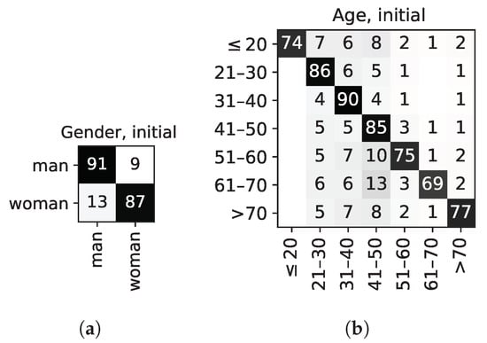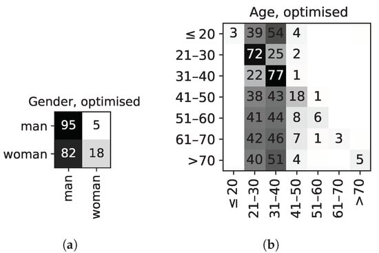 Looking at the results for gender more in depth, Figure 3a shows that 91% of men and 87% of women are correctly classified, and the most confused class is women, which are mistaken for men in 13% of cases: a plausible explanation could be that there are more men in two of the three largest age groups by the number of participants (i.e., ‘21–30 y/o’ and ‘31–40 y/o’).
