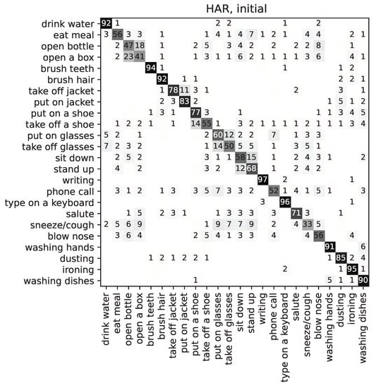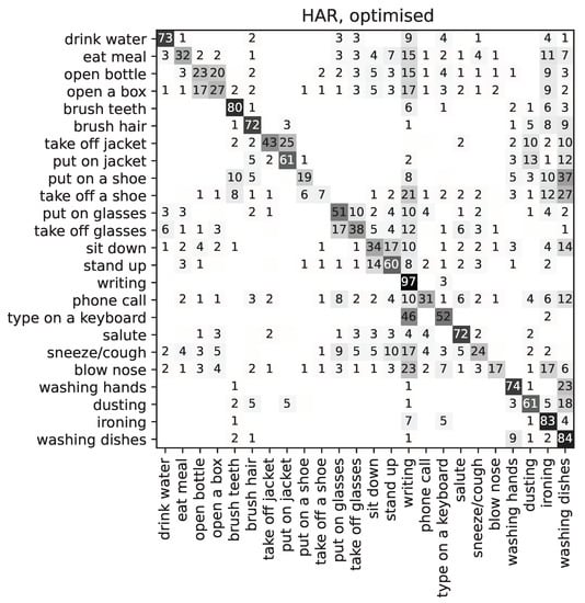 Finally, Figure 8 shows the confusion matrix for ADL recognition (HAR) for the best individual of the population. It can be observed that certain classes are much worse affected by the optimisation than others. Such is the case of ‘take off a shoe’, which is confused with ‘writing’ and ‘washing dishes’, which initially seem very different activities from the point of view of wrist motions. However, some features have been excluded or greatly diminished in their contribution to the overall classification. Since some features that were calculated separately for the three axes may have been affected by the optimisation individually, it is possible that some class labels are now confused with some others that are quite different, only because they share similar values for the unaltered features.