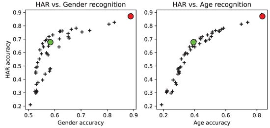 To depict the optimisation undergone by the individuals in the population of the evolutionary algorithm over the course of the generations, Figure 5 shows the final set of solutions (individuals) of the population, showing black crosses for each individual, and a green dot representing the best fit individual (i.e., minimising age and gender recognition, while keeping action recognition as unaltered as possible). The results corresponding to the green dot are also shown in the respective column “best (B)” on Table 2. Please note that this figure is a representation of a scatter, and that the two panels (left and right) depict two planes ( views) of the volume. The planes are provided as for clarity of visualisation. In each panel, a red dot is also included, representing the initial individual (all features weighted to 1.0), which was used to obtain the baseline results. It can be observed (left panel) that while the gender accuracy dropped almost 0.3 (≈30%, 30.6 as shown in Table 2, “Diff. (B-I)” column), the HAR (action) accuracy dropped 0.2 (≈20%, 19.5 as per Table 2). On the right panel, the age vs. action graph is plotted in the same manner. Similarly, it can be observed that, while the age accuracy dropped by 0.4 (≈40%, 44.3 as shown in Table 2), the action (HAR) accuracy dropped by 0.2 (≈20%). An artefact of the representation is shown on the left panel, as the green dot (the best individual), has some black-crossed individuals above it (i.e., with better HAR accuracy, while keeping gender recognition as low as the chosen solution). However, this is not real, as this is, after all, a view of the volume, and it could well be that the crosses depicted above the green dot do not have an equally ‘improved’ correspondence on the right panel (i.e., keeping age prediction low, too).