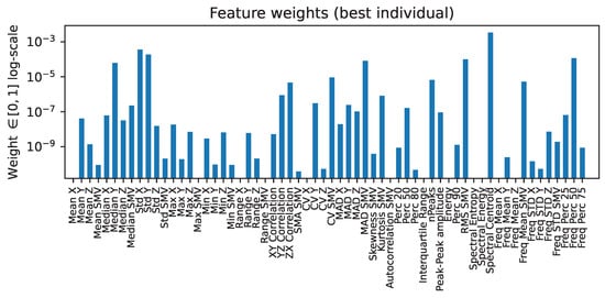 From the best solution (green dot) in Figure 5, it is also worth noting the contributions, i.e., the weights, given to each of the 62 features extracted, as this is indicative of the importance of each of these regarding the leakage of information related to age and gender traits, or conversely, their importance for action recognition. Figure 6 shows this. The x-axis represents each feature, whereas the height of the bars represents the weight assigned to each feature at the end of the evolutionary algorithm for the best candidate individual. Due to the large variation in weight values, the y-axis is logarithmic in scale. It is worth observing the features that have almost been completely zeroed, as those would be the ones that reveal the most sensitive information, namely these are: the ‘Max SMV’, some ‘Range’ values, the ‘Interquartile range’, the ‘Energy’, as well as some frequency domain features, such as ‘Spectral entropy’ and ’Spectral energy’, as well as the ‘freq. Mean’ in most axes. The specifics as for why each has been excluded would lead to a long analysis, but it seems quite logical that frequency domain features are excluded, as these can contain many more information about some harmonics of motion frequency that are not only relevant for motion analysis, but also for particular individual activity performance; thus, leaking information about their identifying traits.