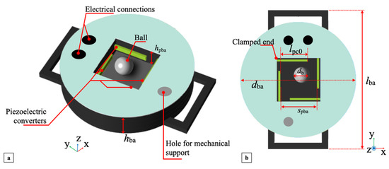 In addition, subsequent impacts on different PCs can occur due to bouncing and angled deviation of the ball path. Four piezoceramic bimorph elements were employed as the PCs. As in the mono-axial harvester, the piezoelectric converters are rectangular parallelepipeds mounted as cantilevers with the face lpc × hpc oriented in the xy-plane, as shown in Figure 3b. The clamped end of each cantilever was placed at 1/5 of length lpc, while the length exposed to impacts is lpc0 ≅ 0.53lpc to keep the ball trajectory in the central region of the confined volume. The harvester structure was assembled in a rigid frame of length lba, composed of cylinder height hba, and diameter dba with electrical connections to the outputs of the embedded PCs and a hole for the mechanical support of external circuitry.