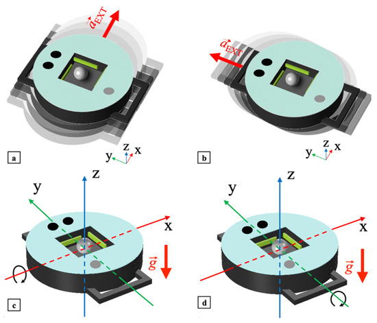 Assuming for reference that the harvester xy-plane is horizontal, four main different excitations can produce impacts on the PCs, namely a shake applied along the x- or y-axis, a tilt induced around the x- or y-axis, as shown in Figure 4a–d, respectively, plus their combinations. As in the mono-axial harvester, in the case of shake excitations, external acceleration