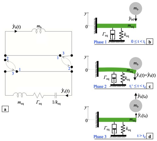 In phase 1, during the time interval before the impact, 0 ≤ t < ti, where ti is the time at which the impact occurs, neglecting the gravitational acceleration and considering the velocities as positive in the direction of the arrows, the ball is assumed in uniform rectilinear motion with constant velocity , as shown in Figure 5b. In this case, since the ball and cantilever are not interacting yet, the switches in Figure 5a are in position 1 thus creating two equivalent lumped-element circuits which are separate and noninteracting. The mass mb and, according to the EM analogy, the equivalent inductance mb in turn, is considered to have an initial current condition whereas the cantilever is supposed at rest at its equilibrium point, i.e.,