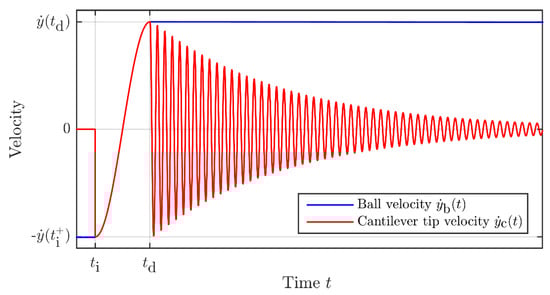 At time t = ti the ball impacts the tip of the cantilever which bends causing an inelastic collision [52]. In phase 2, during the time interval ti+ ≤ t < td, between the impact and detachment time td, the ball and the cantilever remain joined moving downwards with the same velocity, i.e., , as shown in Figure 5c.