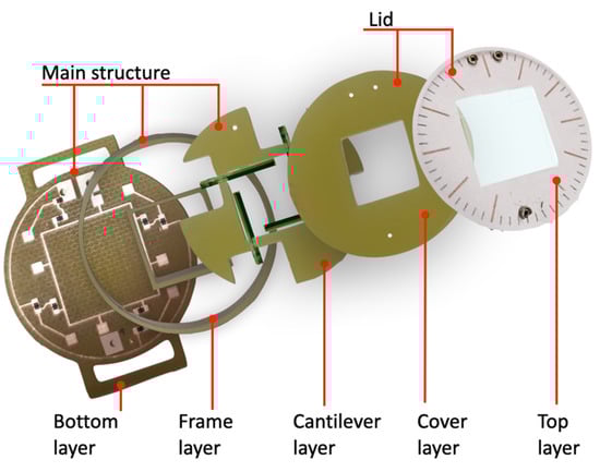 Figure 7 shows the five processed FR-4 layers employed in the bi-axial harvester. A similar composite structure was developed for the mono-axial harvester. The bottom layer embeds the printed circuit board (PCB) and the rectifier circuits of each PC. The frame layer is placed on the bottom layer and is used to protect the electrical components and the PCB and to support the cantilever layer, where each PC was glued firmly into the clamped end. As per the piezoelectric converters, the three FR-4 layers, which compose the main structure of the harvester, have also been glued together with an epoxy resin.