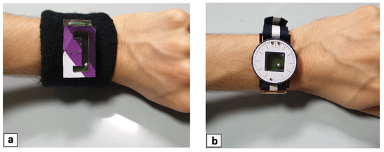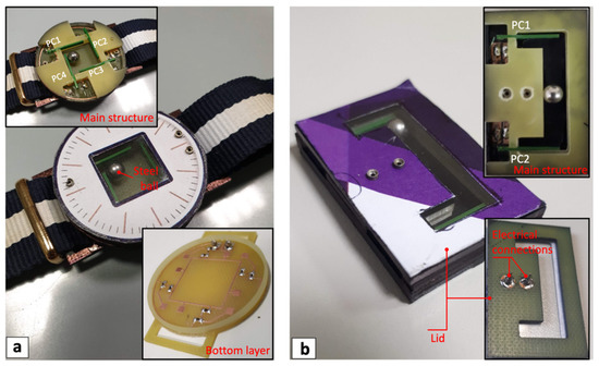 Images of the wearable mono-axial (a) and bi-axial (b) multi-converter harvester prototypes.