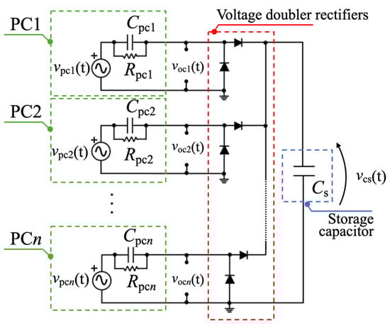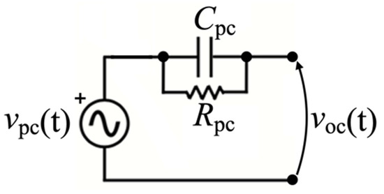 A single PC can be represented by its Thévenin equivalent circuit, comprising a voltage source, vpc(t), in series with the internal impedance of the piezoelectric element [53], made by the parallel of capacitance Cpc and resistance Rpc, as shown in Figure 9.
