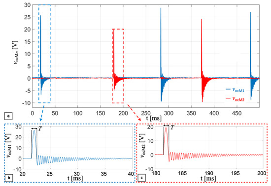 Measured open-circuit voltages, vocMn(t), of piezoelectric converter PC1 (blue curve) and PC2 (red curve) of the mono-axial harvester (a). Enlarged images of a single impact happening against PC1 (b) and PC2 (c).