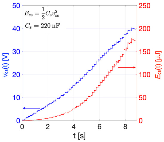 After 8.5 s of consecutive impacts, vcs(t) reached 40.2 V, which, from Equation (9), corresponds to a stored energy of 178 μJ.