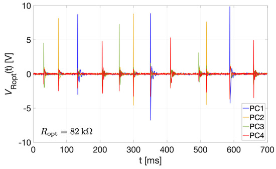 Measured voltages vRopt(t) as a function of time with three different impacts happening against each PCs of the bi-axial harvester PC1, PC2, PC3, and PC4, reported with blue, yellow, green, and red curves, respectively.