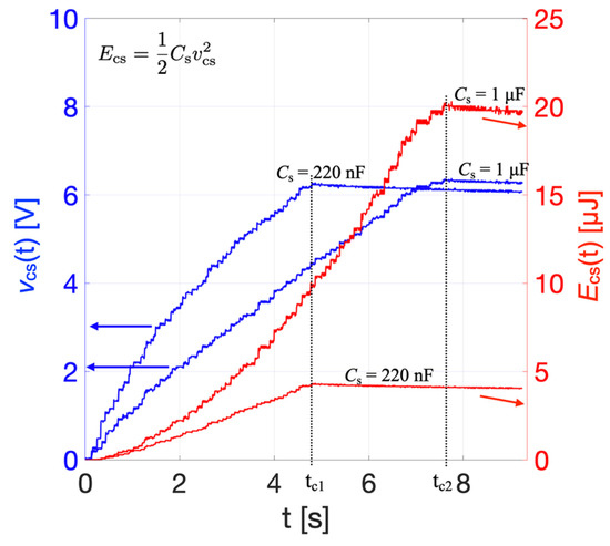 Measured rectified voltage vcs(t) (blue curves) and estimated electrical energy Ecs(t) (red curves) stored employing two different values of storage capacitors Cs.