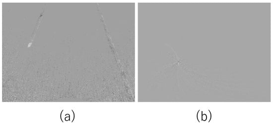 Camera motion estimation is one of the most important technologies in many applications, such as automatic driving and assistive technologies. In particular, motion estimation by pointing a camera at a road surface has an advantage in that objects that can affect it, such as automobiles and pedestrians, are usually not easily visible [,,,,,]. Teshima et al. [] proposed a method to estimate the position and orientation of a vehicle from sequential images of the ground using the known homography obtained from a normal camera. Saurer et al. [] proposed a method to find different minimal solutions for egomotion estimation of a camera based on homography knowing the gravity vector between images. Gilles et al. [] proposed a method based on unsupervised deep learning for motion estimation with a downward-looking camera. However, in spite of active research, camera motion estimation by using the road surface has the following problems: it is difficult to extract and match feature points robustly from noisy ground textures; the high-speed movement of cameras causes motion blur; it often involves challenging illumination conditions.