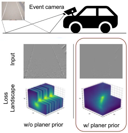 Motion estimation using event cameras has also been studied. Weikersdorfer et al. [,] captured images of a ceiling using an event camera mounted upward and used particle filters to estimate the position of the camera, which was moving parallel to the plane. However, this method requires capturing a plane in parallel and a black-and-white line pattern in the scene. Kim et al. [,] proposed a method to jointly estimate six degrees of freedom (DoFs) of the camera, depth, and intensity gradient of the scene. The results were limited to small-scale environments and motions. Gallego et al. [] proposed to estimate rotational motion by accumulating events over a small time window into an image and maximizing the variance of the image. Gallego et al. [,] proposed a contrast maximization framework, based on the method of []. This framework maximizes the contrast of the image by warping events according to the model parameters and accumulating the warped events onto the IWE. Nunes et al. [] proposed a method called entropy minimization, based on contrast maximization, that performs motion estimation without projecting onto the IWE. However, as shown by Nunes et al. [], both contrast maximization and entropy minimization have the problem that the loss function may have multiple extrema.
