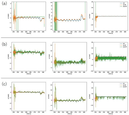 Results of the quantitative experiments. Blue: ground truth. Orange: proposed method with the bird’s-eye view transformation (w/BT). Green: entropy minimization method without the bird’s-eye view transformation (w/o BT). (a) Condition (a). (b) Condition (b). (c) Condition (c).