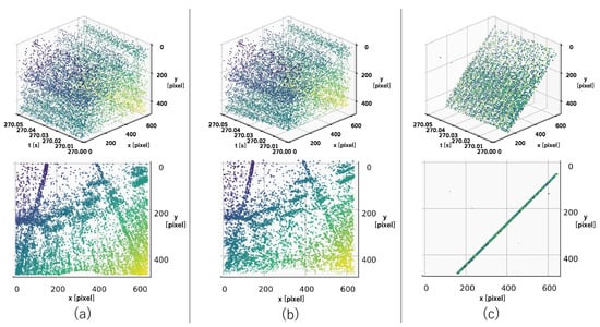 Event cameras [] have been developed with features that can address these problems. Instead of recording an image intensity at a synchronous frame rate, event cameras record asynchronous positive and negative spikes, called events, in response to changes in the brightness of a scene. Therefore, the output is not an intensity image, but a stream of asynchronous events, where each event consists of its space–time coordinates. The advantages of event cameras include their high temporal resolution (s order), high dynamic range (130 dB), and low power consumption [,], as well as the ability to acquire data without blurring, even when the event camera itself is moving at high speed. However, they are fundamentally different in their operating characteristics from traditional frame-based cameras; thus, they require completely new algorithms.