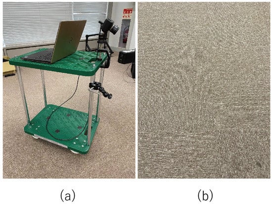 (a) Experimental setup. An event camera was mounted on a dolly at an angle (not parallel) to the surface of interest. (b) Carpeted surface; it would be difficult to extract its features with a normal camera.