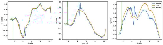 Results of the motion estimation experiment on a carpeted surface. Blue: ARKit4. Orange: proposed method with the bird’s-eye view transformation. Green: entropy minimization method without the bird’s-eye view transformation.