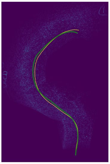 Figure 9 shows the distribution of the entropy near the true value with and without the bird’s-eye view transformation. In the case of homographic motion estimation, we can see that several local extrema appeared near the true value. In addition, over a wider range, local extrema with lower entropy than the true value appeared. In contrast, in the case of the isometric motion estimation with a bird’s-eye view transformation, the distribution of the entropy was convex over a somewhat wide range. Therefore, it can be said that the bird’s-eye view transformation helped with the relatively fast convergence of the correct solution value, while preventing falling into a local solution.