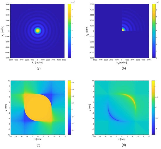 (a) Disk Directivity in k−space (|2D−FT|) (5.0 [mm] radius). (b) Imposed Directivity equal to that of a disk in [0°,90°] and 0 elsewhere. (c,d) Real part and imaginary part of 2D−IFT: the ideal shape functions continuously modulated.