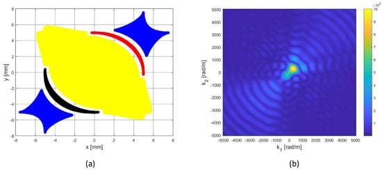 Figure 3b shows the actual 2D-FT (absolute value) in the k-space domain, i.e., the 2D-FT computed after the quantization of the shape function. Due to quantization, the values of the 2D-FT, out of [0°,90°], are not 0, but are still smaller than values in the monitored angular sector.