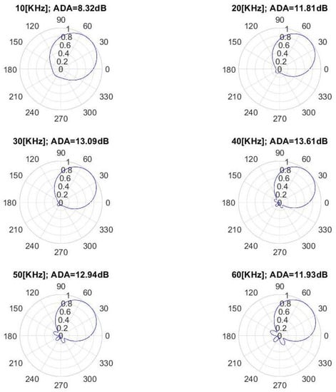 The directivity properties at each frequency can be expressed by the Average Directional Attenuation (ADA) parameter. It is computed by the beampatterns values, as the ratio between the average beampattern value in the monitored angular sector (i.e., [0–90]°) and out of that one. In Figure 4, the ADA values for different frequency values are shown. The ADA value is above 8.3 dB in the [10–60] [kHz] band, and 13.0 dB in the [30–60] [kHz] band.