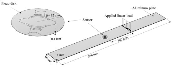 To validate the DSC performance, the theoretical beampatterns predicted by the model have been compared with the ones resulting from finite element (FE) simulations. To do so, a three-dimensional COMSOL® [] based FE model of the proposed DSC was built. In the numerical model, an aluminum plate with dimensions of 500 [mm] × 60 [mm] and thickness 1 [mm] was chosen as the propagation medium. Since it is sufficient to shape just one metalization of the DCS (top or bottom) to achieve the desired directive behavior, the DCS was modeled using the geometry obtained in the design procedure, below which a small disk of piezoelectric material with a radius of 12 [mm] was defined. Then, the DCS was attached to the plate as shown in Figure 6.