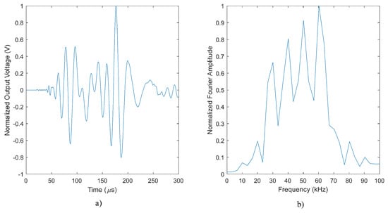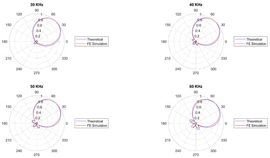 By using Equation (25), the DCS sensor theoretical beampatterns were computed at different values of frequency, considering the wave vector values of A0 mode when propagating in an aluminum plate with 1 [mm] thickness (i.e., for a known dispersion curve ). As shown in Figure 4, useful directive beampatterns are achieved in the [10–60] [kHz] frequencies band. However, the best directional behavior is achieved in the [30–60] [kHz] frequency range.