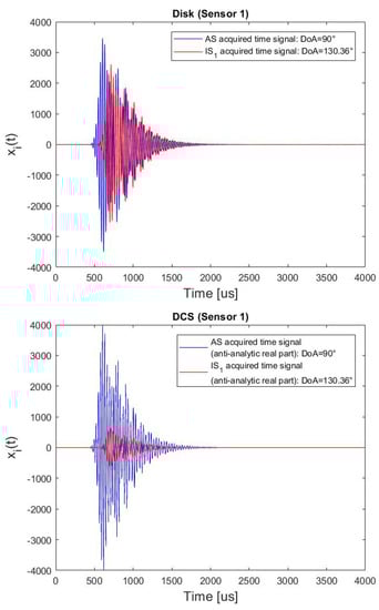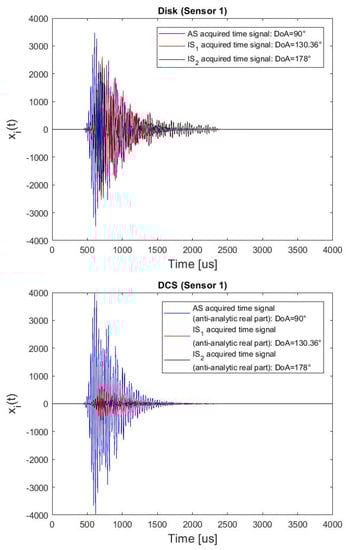 Superposition of three acquired signals, the AS to be detected and to two undesired components (coherent and incoherent interference due to two ISs of the current AS and the AS of a previous impact/defect), when the sensor is a Disk (top plot) and a DCS (bottom plot).