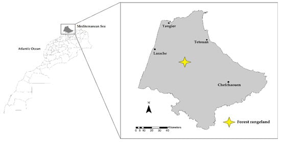 The study was conducted on forested rangeland of Beni Arouss, Rif region, northern Morocco (Figure 1). This woodland is located at an altitude ranging between 250 and 550 m a.s.l (35°18′ N; 5°34′ W). The climate is Mediterranean (rainy and cold in winter and mild in summer), with an annual rainfall varying between 400- and 700-mm. Temperatures range from 3 to 14 °C in winter and from 18 to 38 °C in summer (minimum and maximum, respectively) []. The studied pasture is a Mediterranean forest rangeland with vegetation units that go from low formations of Cistus species (inclusive of C. crispus, C. monspeliensis, and C. salviifolius) to the high oak groves. Tree vegetation includes Quercus spp. (inclusive of Q. coccifera, Q. ilex, and Q. suber) associated with shrublands dominated by Arbutus unedo, Cistus spp., and Erica arborea [,].