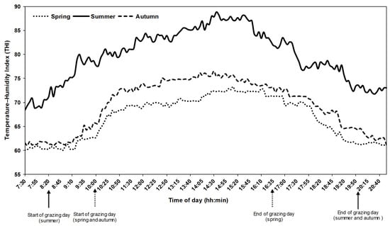 The mean of daily RH values ranged from 11 to 40, 33 to 79, and 17 to 60% in spring, summer, and autumn, respectively. The mean of daily Ta values ranged between 17 and 31, 22 and 37, and 20 and 32 °C in spring, summer, and autumn, respectively. Hence, the mean daily THI was 66-, 69-, and 80-units during spring, autumn, and summer, respectively. The highest values of THI in different seasons were recorded between 12 h and 16 h (middle of the day) as displayed in Figure 3.